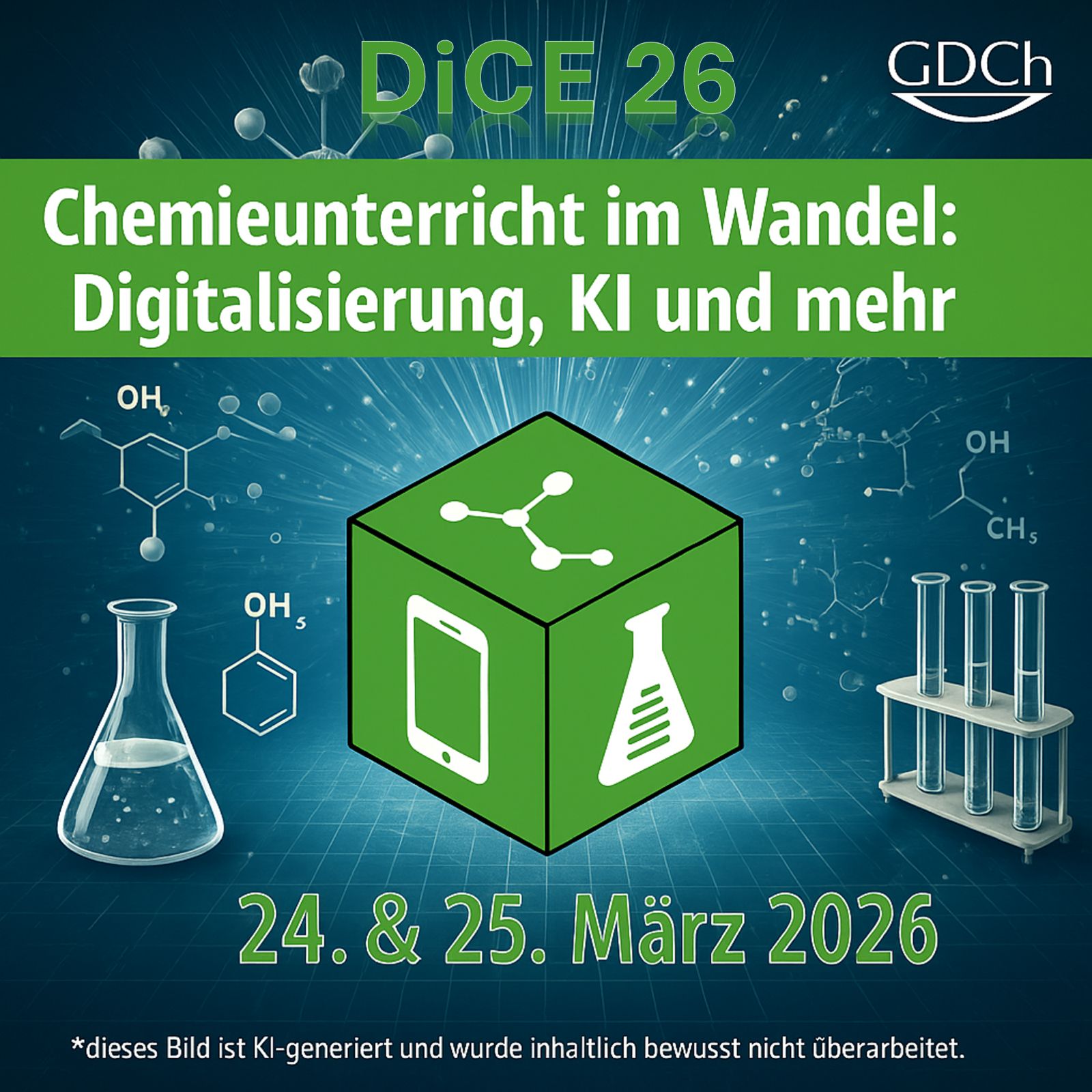 Die AG DiCE begrüßt Sie herzlich zur DiCE-Tagung 2026! Ziel der Tagung ist es, den Austausch über die aktuellen Themen des digitalen Chemieunterrichts mit Studierenden, Lehrkräften und Fachkolleg*innen voranzutreiben. Diese findet online am 24.03.2026 (14 - 18 Uhr) sowie am 25.03.2026 (09 -17 Uhr) statt. Vorgeschaltet ist ein Nachwuchsmeeting, welches am 24.03.2026 von 10 - 12 Uhr veranstaltet wird.